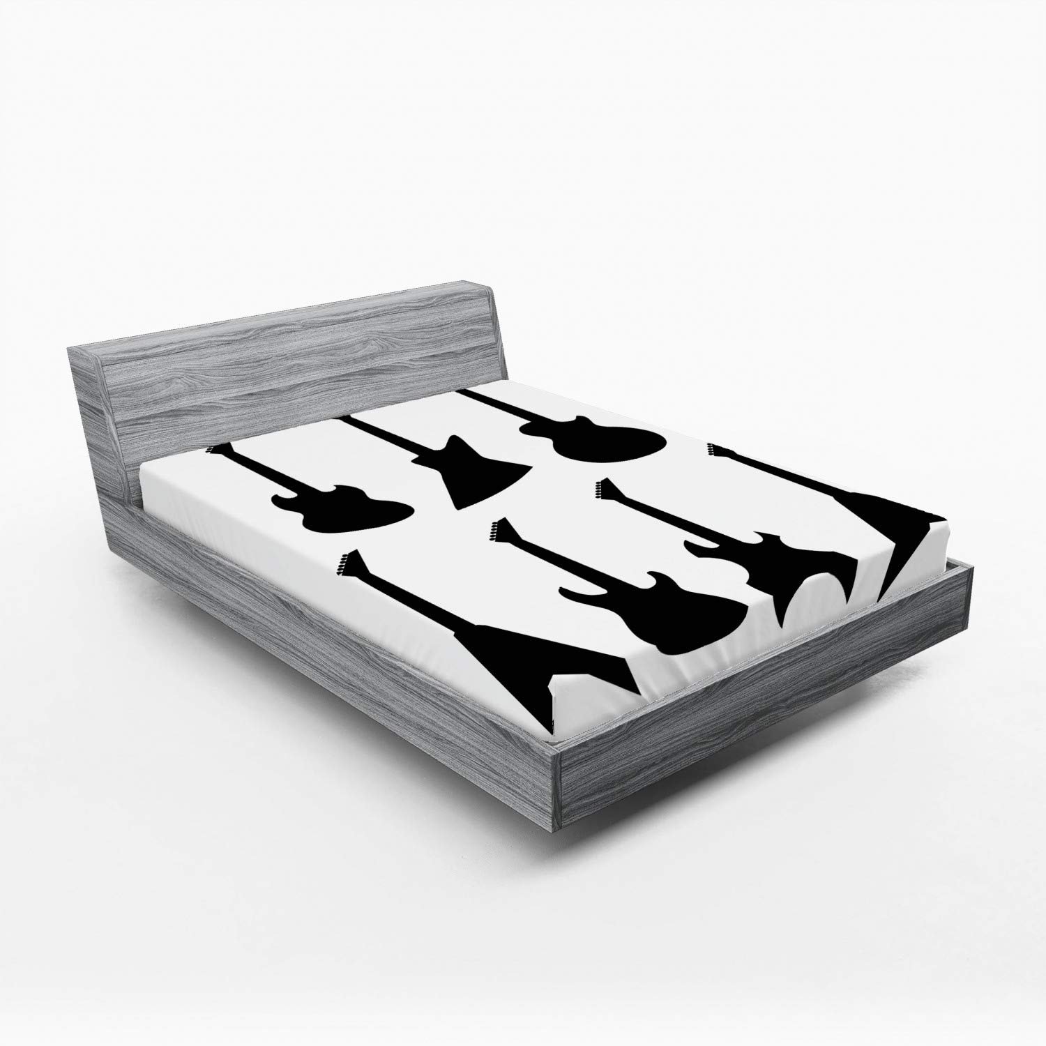 Ambesonne Rock Music Fitted Sheet, Various Guitar Silhouettes Acoustic Electronic Bass Abstract String Instruments, Bed Cover wi