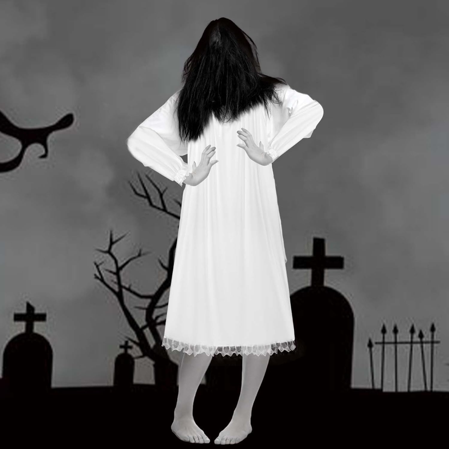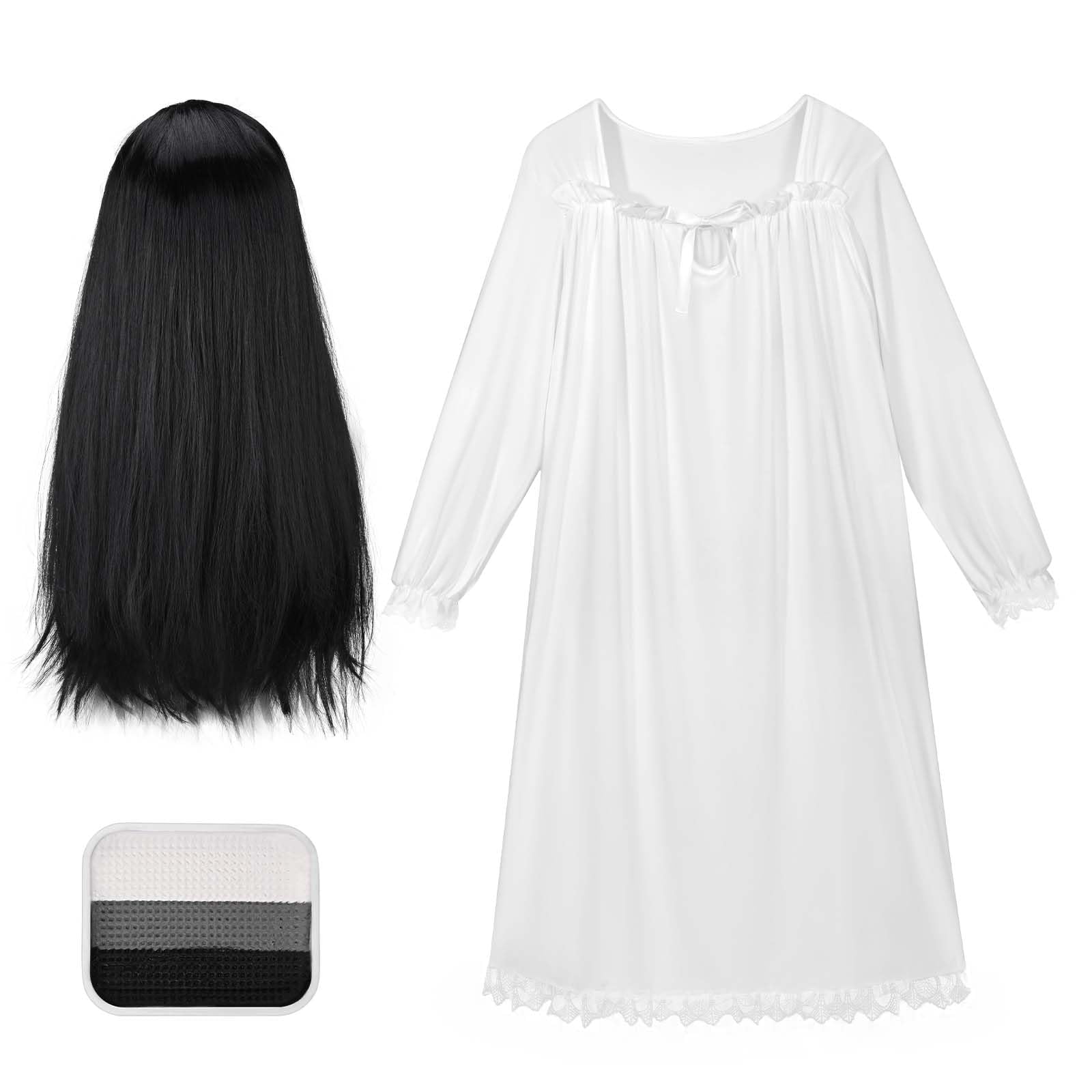 Halloween Costume Set 2 Pcs Women Ghost Costume Set with White Victorian Vintage Nightgown Gown Black Wig Medium