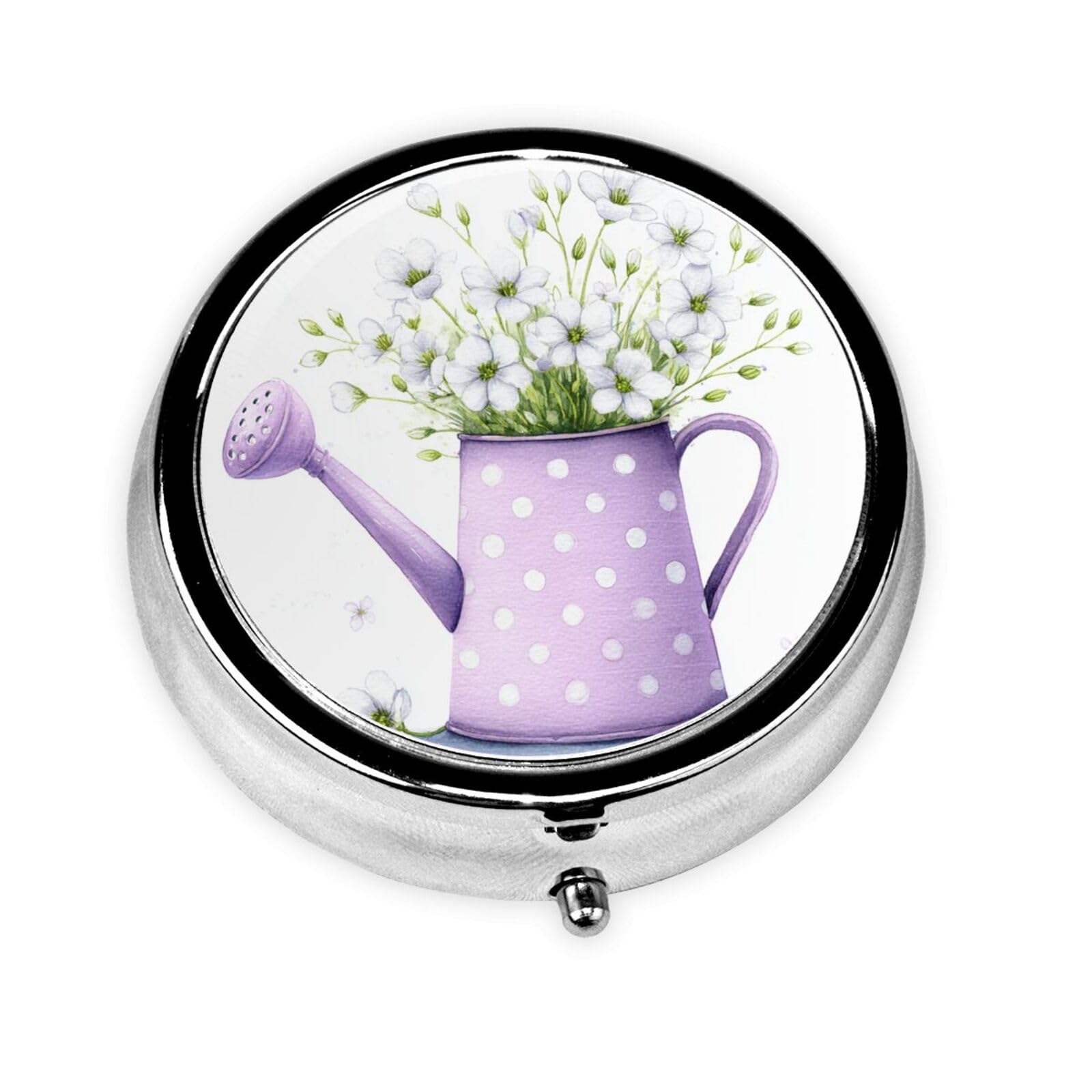 Light Purple and White Polka Dot Watering Can Round Pill Case, Portable Pill Box for Pocket Metal Medicine Vitamin Organizer 3 C